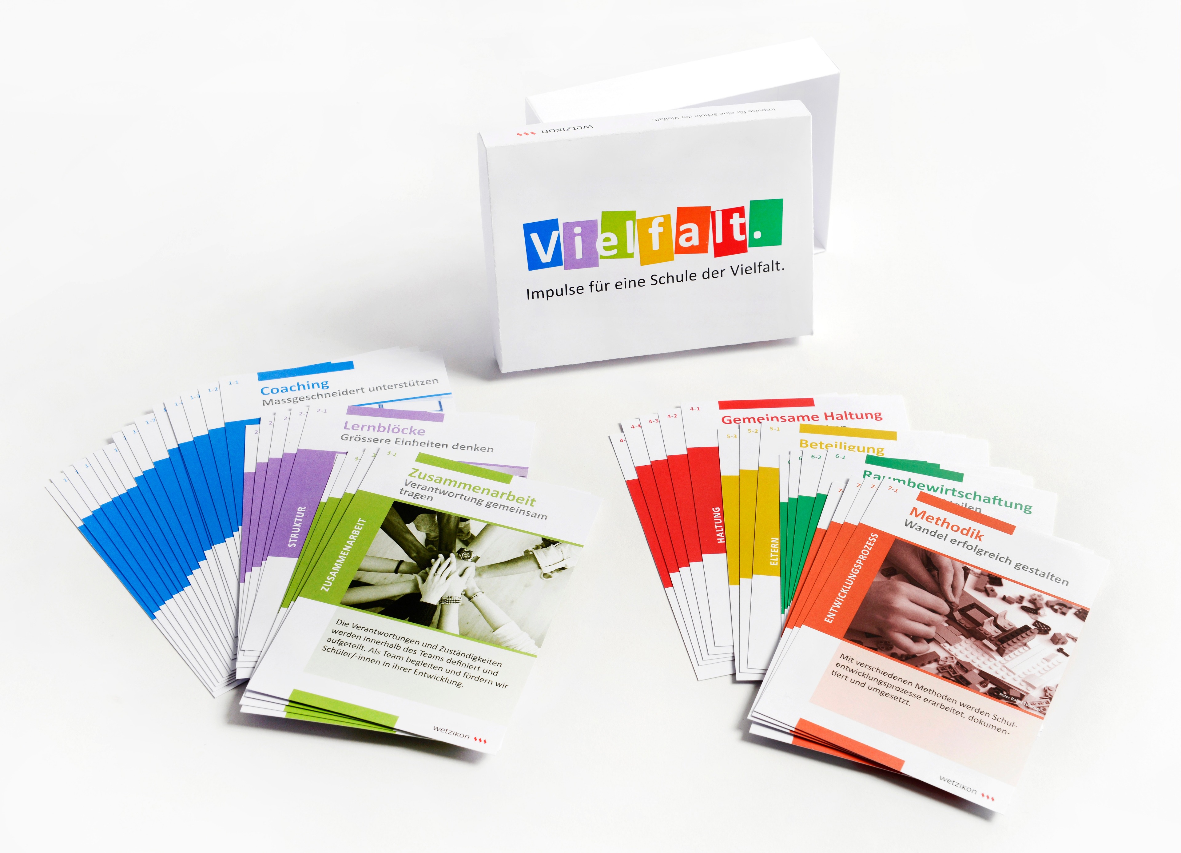 Schulpflege, Schulleitungen und Lehrpersonen haben in den letzten Monaten entsprechende Ideen entwickelt und schrittweise konkretisiert: Entstanden ist ein Kartenset mit inhaltlich aufeinander abgestimmten Impulsen, aufgeteilt in die sieben Themenbereiche «Lernen», «Zusammenarbeit», «Struktur», «Eltern», «Entwicklungsprozess», «Haltung» und «Räume». Jeder Themenbereich beinhaltet verschiedene Aspekte mit praktischen Anwendungsbeispielen für den Schulalltag.