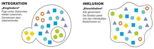 Die Inklusion ist eine Weiterführung der bisherigen Integration. Bei der Integration geht es um die Frage, wie ein Kind unterstützt werden kann, damit es in die Schule passt. Man geht also "vom Kind aus". Die Inklusion stellt sich die Frage, wie sich die Schule anpassen muss, damit alle Schülerinnen und Schüler gut lernen können. Die Anpassungsleistung erfolgt somit auf Seiten der Schule.